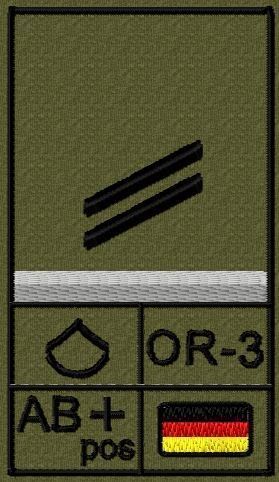 Dienstgradabzeichen auf Klett mit NATO-Rangcode, dem US Army-Dienstgrad, der Deutschlandflagge und der Blutgruppe mit Rhesusfaktor aufgestickt. Passt ideal auf das BW Unterhemd mit Klett auf der Brust oder auch auf dem Smock. Der Patch hat die Maße: B: 5,2cm x L: 9,3cm. Achtung: Bei der Auswahl der