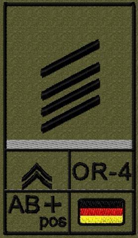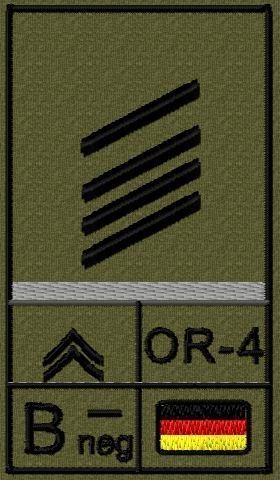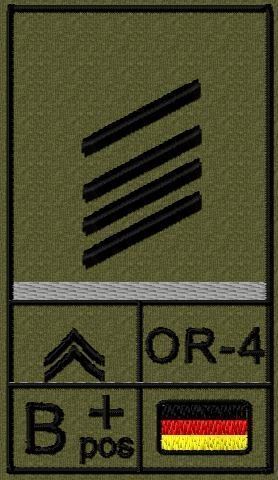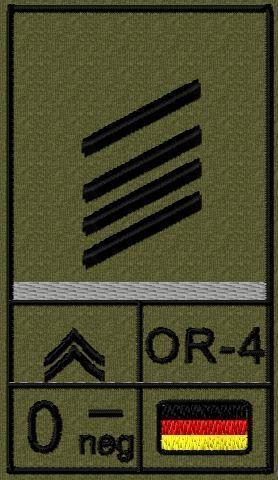 Dienstgradabzeichen auf Klett mit NATO-Rangcode, dem US Army-Dienstgrad, der Deutschlandflagge und der Blutgruppe mit Rhesusfaktor aufgestickt. Passt ideal auf das BW Unterhemd mit Klett auf der Brust oder auch auf dem Smock. Der Patch hat die Maße: B: 5,2cm x L: 9,3cm. Achtung: Bei der Auswahl der