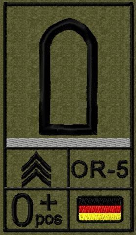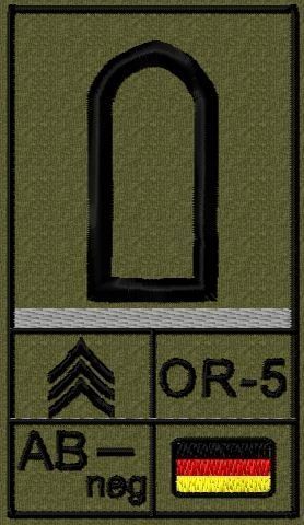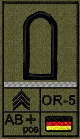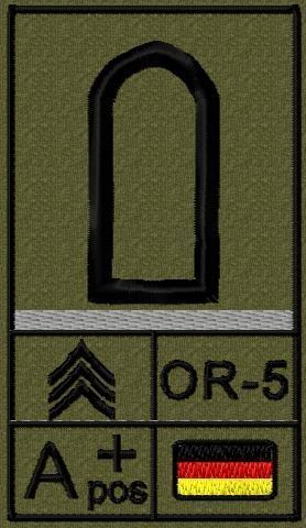Dienstgradabzeichen auf Klett mit NATO-Rangcode, dem US Army-Dienstgrad, der Deutschlandflagge und der Blutgruppe mit Rhesusfaktor aufgestickt. Passt ideal auf das BW Unterhemd mit Klett auf der Brust oder auch auf dem Smock. Der Patch hat die Maße: B: 5,2cm x L: 9,3cm. Achtung: Bei der Auswahl der