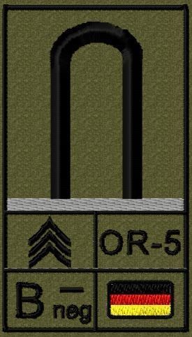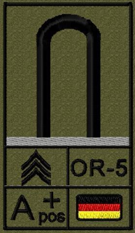 Dienstgradabzeichen auf Klett mit NATO-Rangcode, dem US Army-Dienstgrad, der Deutschlandflagge und der Blutgruppe mit Rhesusfaktor aufgestickt. Passt ideal auf das BW Unterhemd mit Klett auf der Brust oder auch auf dem Smock. Der Patch hat die Maße: B: 5,2cm x L: 9,3cm. Achtung: Bei der Auswahl der