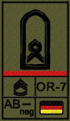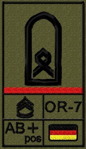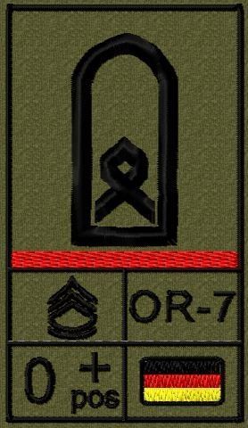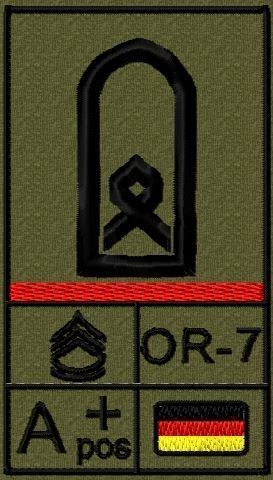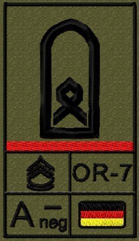 Dienstgradabzeichen auf Klett mit NATO-Rangcode, dem US Army-Dienstgrad, der Deutschlandflagge und der Blutgruppe mit Rhesusfaktor aufgestickt. Passt ideal auf das BW Unterhemd mit Klett auf der Brust oder auch auf dem Smock. Der Patch hat die Maße: B: 5,2cm x L: 9,3cm. Wir halten uns bei der Zuordn