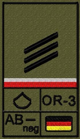 Dienstgradabzeichen auf Klett mit NATO-Rangcode, dem US Army-Dienstgrad, der Deutschlandflagge und der Blutgruppe mit Rhesusfaktor aufgestickt. Passt ideal auf das BW Unterhemd mit Klett auf der Brust oder auch auf dem Smock. Der Patch hat die Maße: B: 5,2cm x L: 9,3cm. Achtung: Bei der Auswahl der