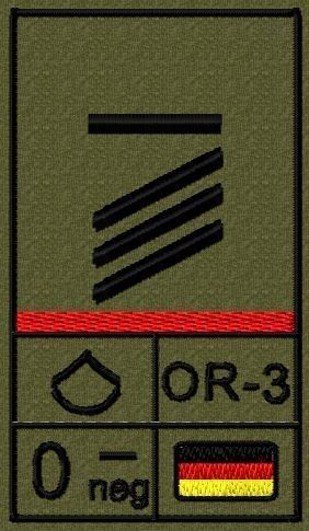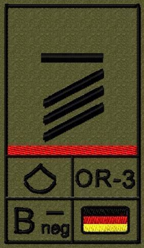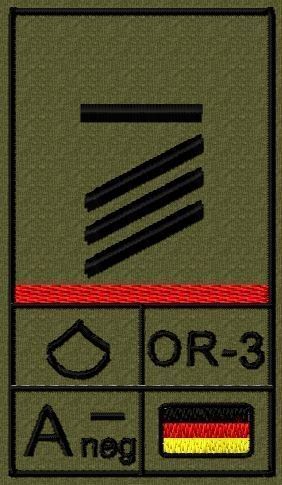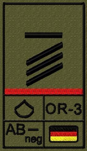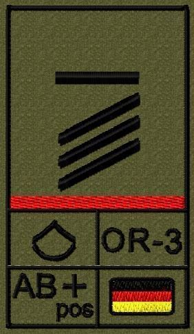 Dienstgradabzeichen auf Klett mit NATO-Rangcode, dem US Army-Dienstgrad, der Deutschlandflagge und der Blutgruppe mit Rhesusfaktor aufgestickt. Passt ideal auf das BW Unterhemd mit Klett auf der Brust oder auch auf dem Smock. Der Patch hat die Maße: B: 5,2cm x L: 9,3cm. Achtung: Bei der Auswahl der