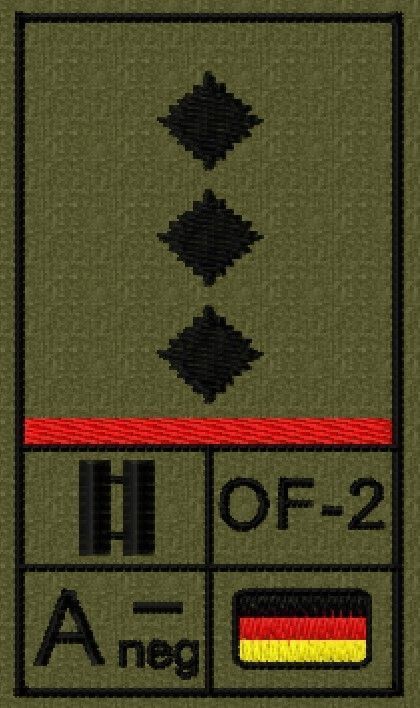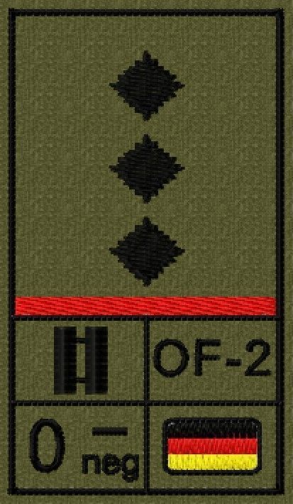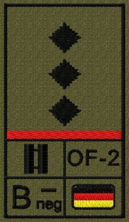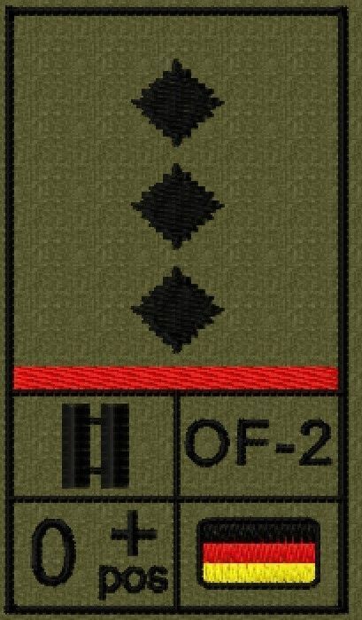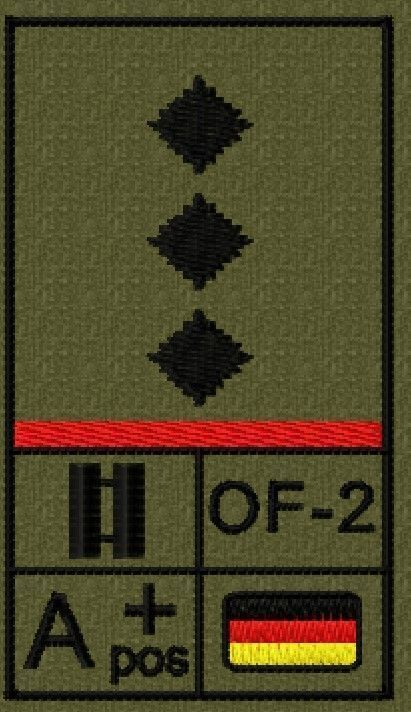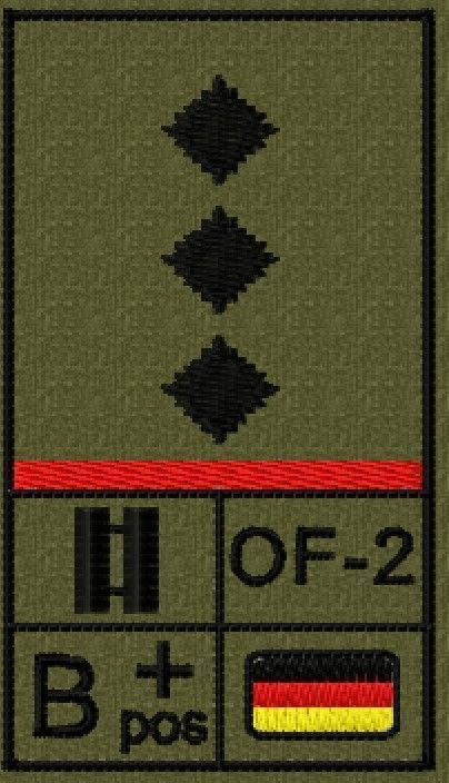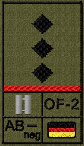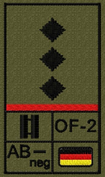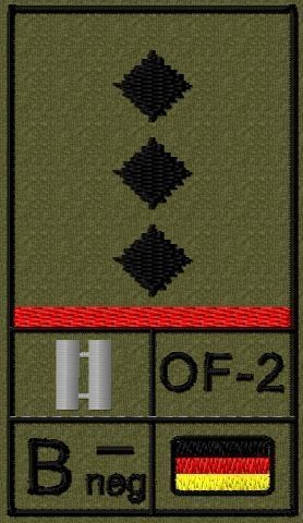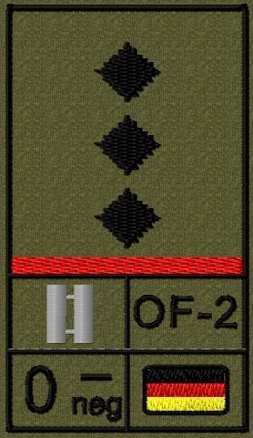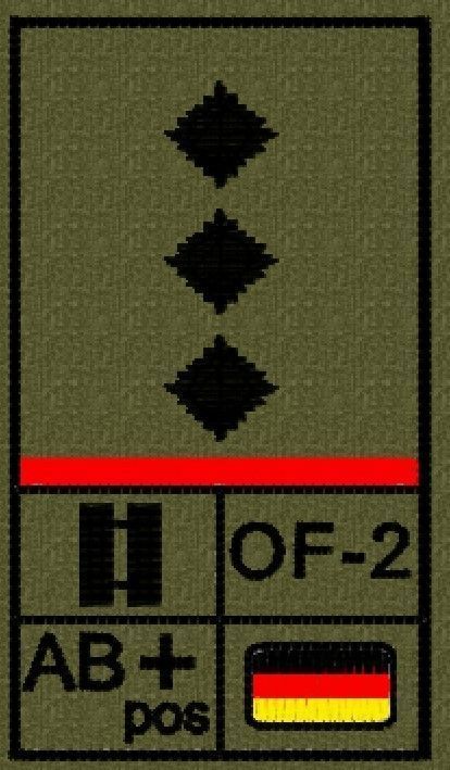 Dienstgradabzeichen auf Klett mit NATO-Rangcode, dem US Army-Dienstgrad, der Deutschlandflagge und der Blutgruppe mit Rhesusfaktor aufgestickt. Passt ideal auf das BW Unterhemd mit Klett auf der Brust oder auch auf dem Smock. Der Patch hat die Maße: B: 5,2cm x L: 9,3cm. Achtung: Bei der Auswahl der