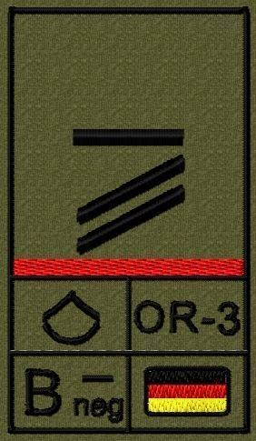 Dienstgradabzeichen auf Klett mit NATO-Rangcode, dem US Army-Dienstgrad, der Deutschlandflagge und der Blutgruppe mit Rhesusfaktor aufgestickt. Passt ideal auf das BW Unterhemd mit Klett auf der Brust oder auch auf dem Smock. Der Patch hat die Maße: B: 5,2cm x L: 9,3cm. Achtung: Bei der Auswahl der
