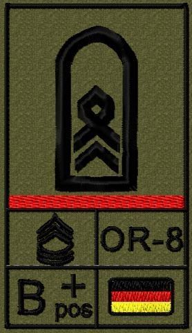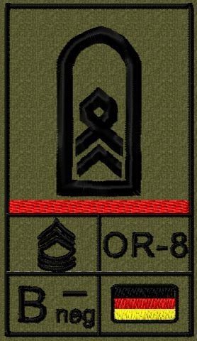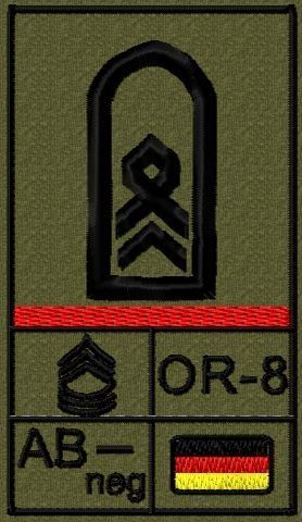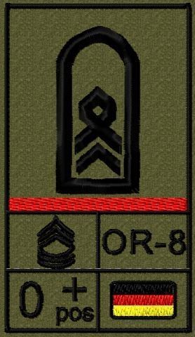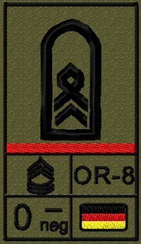 Dienstgradabzeichen auf Klett mit NATO-Rangcode, dem US Army-Dienstgrad, der Deutschlandflagge und der Blutgruppe mit Rhesusfaktor aufgestickt. Passt ideal auf das BW Unterhemd mit Klett auf der Brust oder auch auf dem Smock. Der Patch hat die Maße: B: 5,2cm x L: 9,3cm. Achtung: Bei der Auswahl der