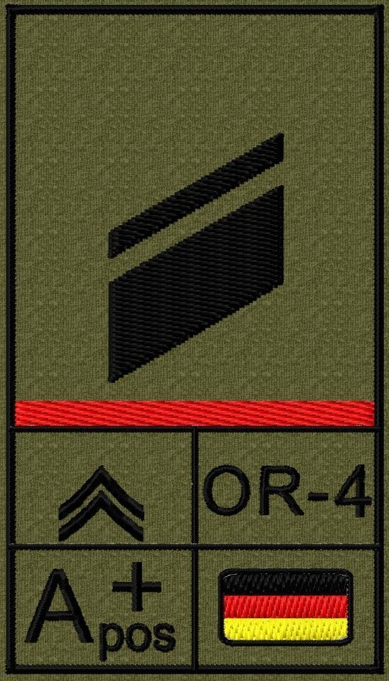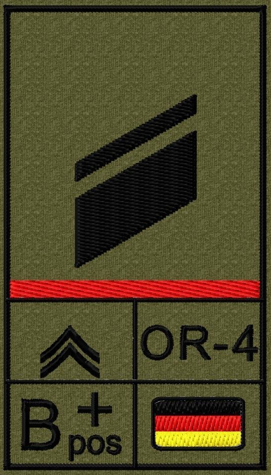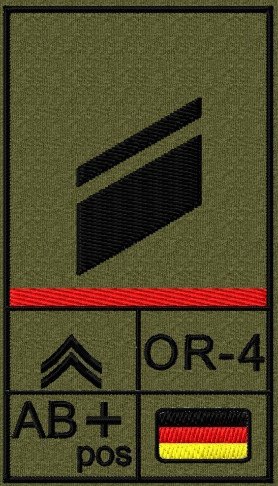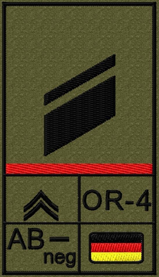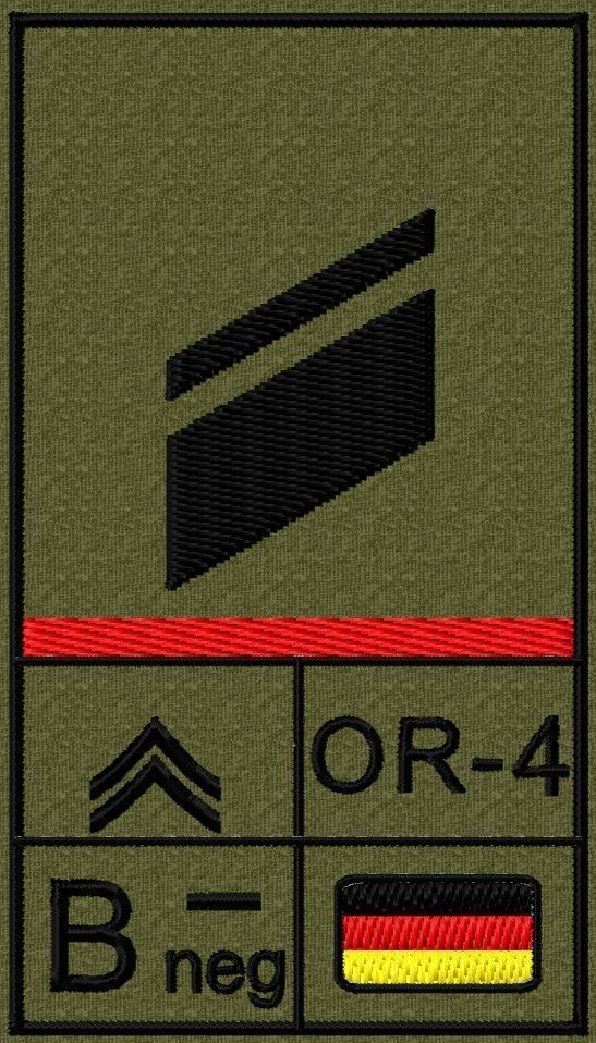 Dienstgradabzeichen auf Klett mit NATO-Rangcode, dem US Army-Dienstgrad, der Deutschlandflagge und der Blutgruppe mit Rhesusfaktor aufgestickt. Passt ideal auf das BW Unterhemd mit Klett auf der Brust oder auch auf dem Smock. Der Patch hat die Maße: B: 5,2cm x L: 9,3cm. Achtung: Bei der Auswahl der