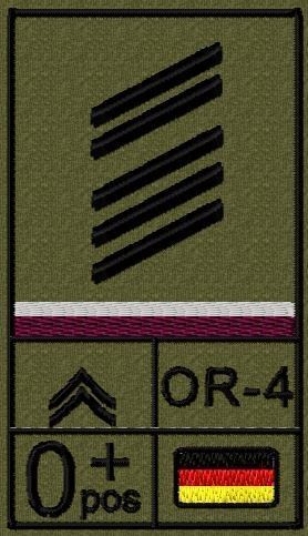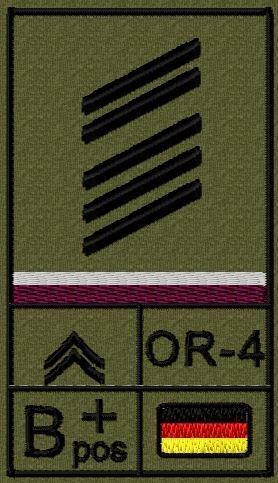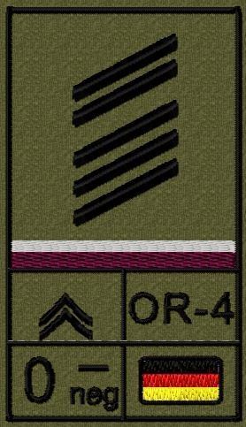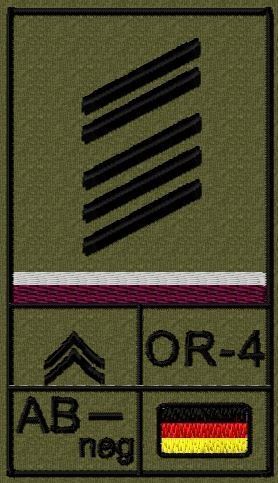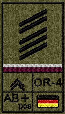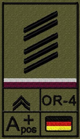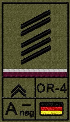 Dienstgradabzeichen auf Klett mit NATO-Rangcode, dem US Army-Dienstgrad, der Deutschlandflagge und der Blutgruppe mit Rhesusfaktor aufgestickt. Passt ideal auf das BW Unterhemd mit Klett auf der Brust oder auch auf dem Smock. Der Patch hat die Maße: B: 5,2cm x L: 9,3cm. Achtung: Bei der Auswahl der
