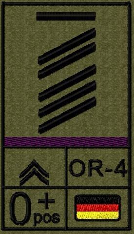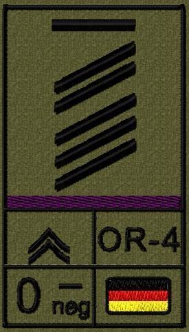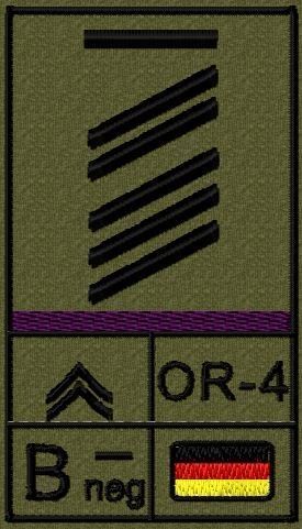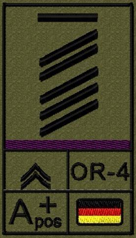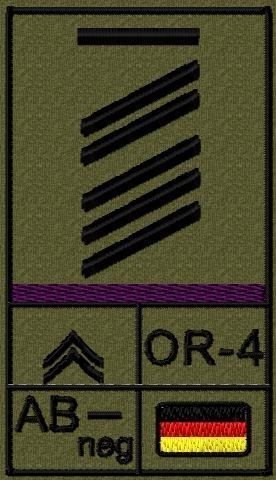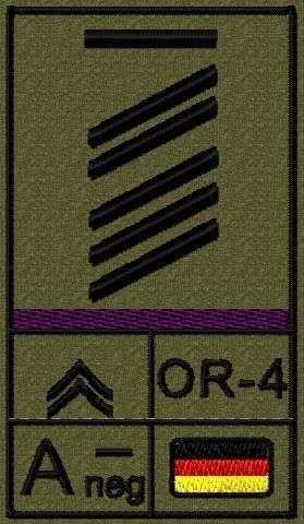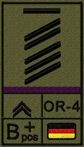Dienstgradabzeichen auf Klett mit NATO-Rangcode, dem US Army-Dienstgrad, der Deutschlandflagge und der Blutgruppe mit Rhesusfaktor aufgestickt. Passt ideal auf das BW Unterhemd mit Klett auf der Brust oder auch auf dem Smock. Der Patch hat die Maße: B: 5,2cm x L: 9,3cm. Achtung: Bei der Auswahl der
