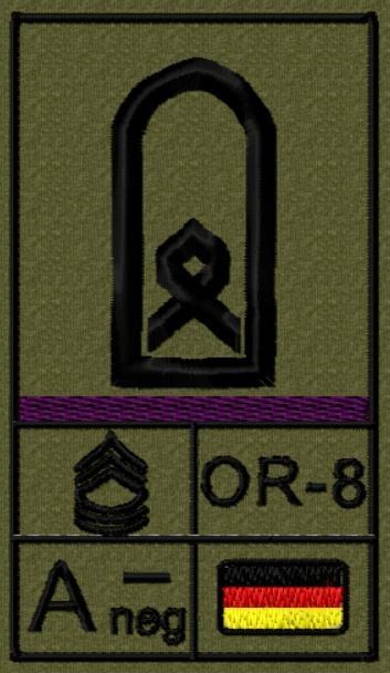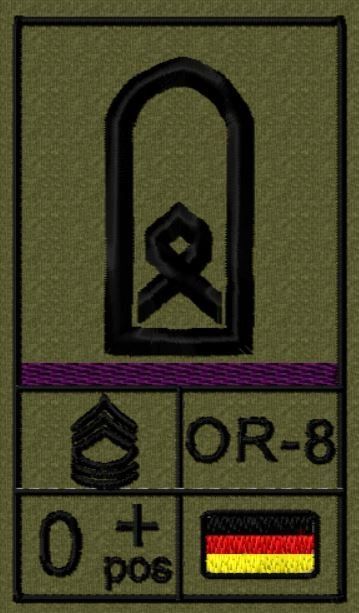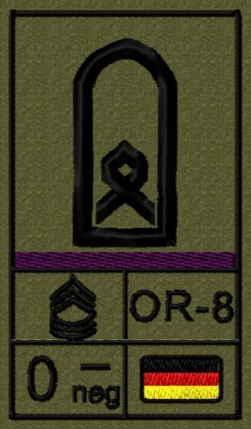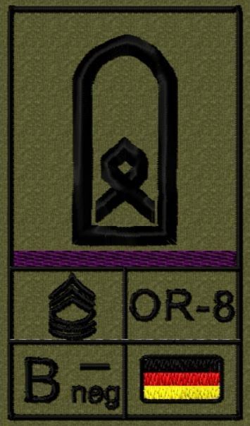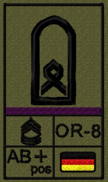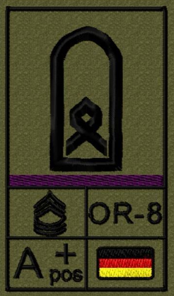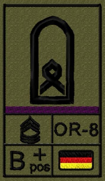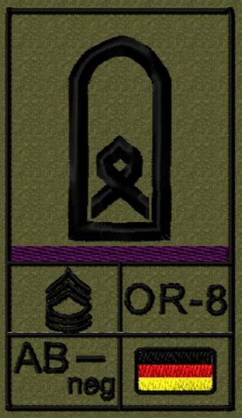 Dienstgradabzeichen auf Klett mit NATO-Rangcode, dem US Army-Dienstgrad, der Deutschlandflagge und der Blutgruppe mit Rhesusfaktor aufgestickt. Passt ideal auf das BW Unterhemd mit Klett auf der Brust oder auch auf dem Smock. Der Patch hat die Maße: B: 5,2cm x L: 9,3cm. Wir halten uns bei der Zuordn