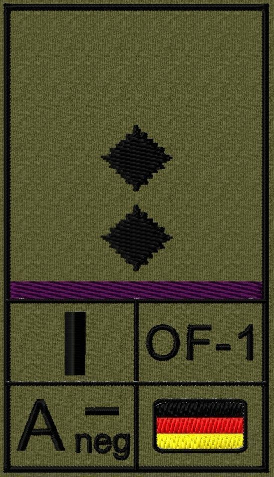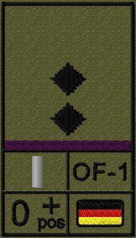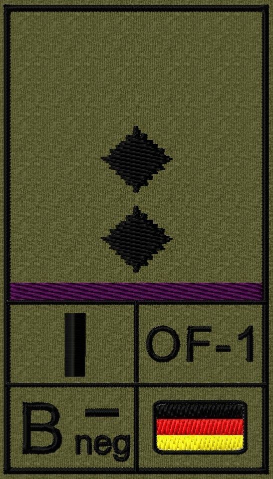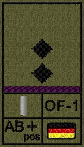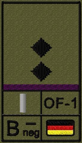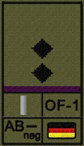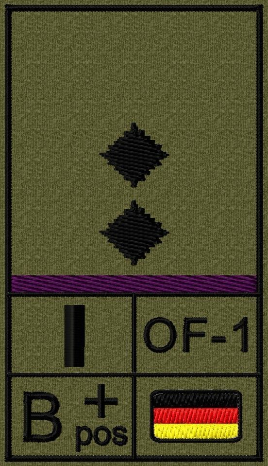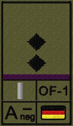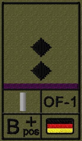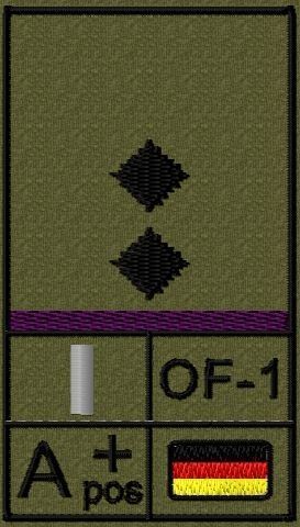 Dienstgradabzeichen auf Klett mit NATO-Rangcode, dem US Army-Dienstgrad, der Deutschlandflagge und der Blutgruppe mit Rhesusfaktor aufgestickt. Passt ideal auf das BW Unterhemd mit Klett auf der Brust oder auch auf dem Smock. Der Patch hat die Maße: B: 5,2cm x L: 9,3cm. Achtung: Bei der Auswahl der
