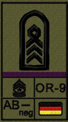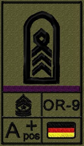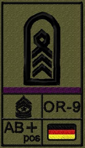 Dienstgradabzeichen auf Klett mit NATO-Rangcode, dem US Army-Dienstgrad, der Deutschlandflagge und der Blutgruppe mit Rhesusfaktor aufgestickt. Passt ideal auf das BW Unterhemd mit Klett auf der Brust oder auch auf dem Smock. Der Patch hat die Maße: B: 5,2cm x L: 9,3cm. Achtung: Bei der Auswahl der