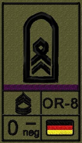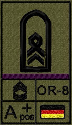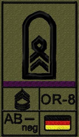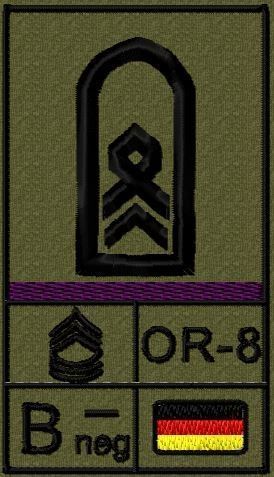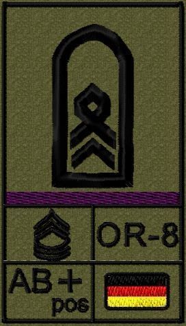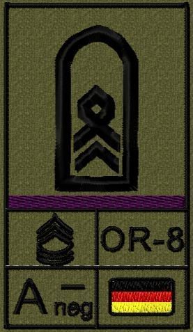 Dienstgradabzeichen auf Klett mit NATO-Rangcode, dem US Army-Dienstgrad, der Deutschlandflagge und der Blutgruppe mit Rhesusfaktor aufgestickt. Passt ideal auf das BW Unterhemd mit Klett auf der Brust oder auch auf dem Smock. Der Patch hat die Maße: B: 5,2cm x L: 9,3cm. Achtung: Bei der Auswahl der