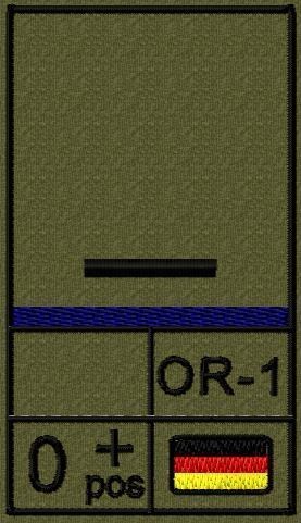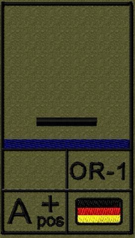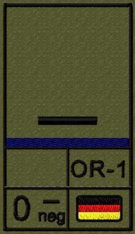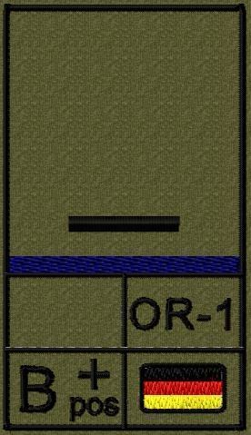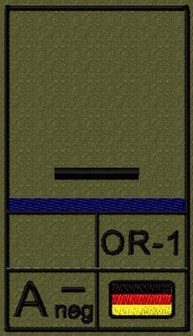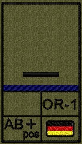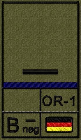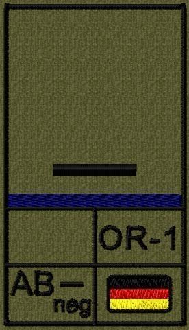 Dienstgradabzeichen auf Klett mit NATO-Rangcode, dem US Army-Dienstgrad, der Deutschlandflagge und der Blutgruppe mit Rhesusfaktor aufgestickt. Passt ideal auf das BW Unterhemd mit Klett auf der Brust oder auch auf dem Smock. Der Patch hat die Maße: B: 5,2cm x L: 9,3cm. Achtung: Bei der Auswahl der