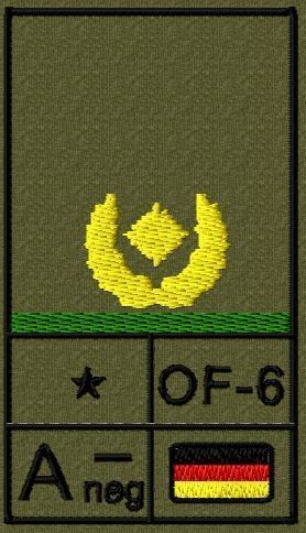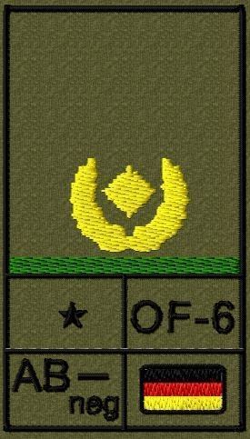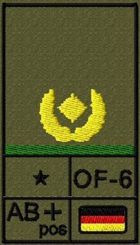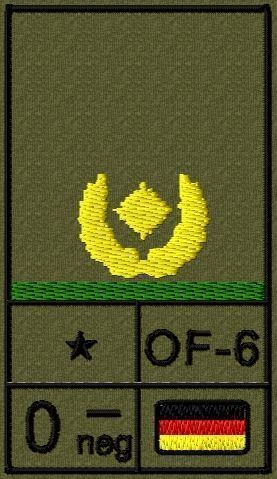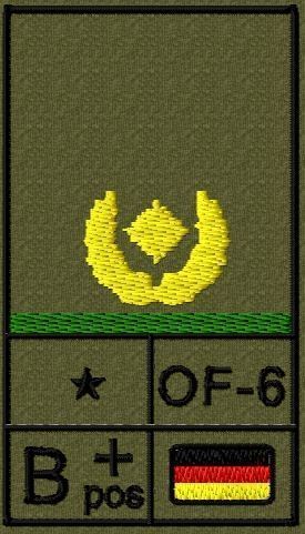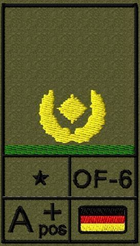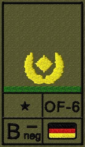 Dienstgradabzeichen auf Klett mit NATO-Rangcode, dem US Army-Dienstgrad, der Deutschlandflagge und der Blutgruppe mit Rhesusfaktor aufgestickt. Passt ideal auf das BW Unterhemd mit Klett auf der Brust oder auch auf dem Smock. Der Patch hat die Maße: B: 5,2cm x L: 9,3cm. Achtung: Bei der Auswahl der