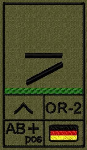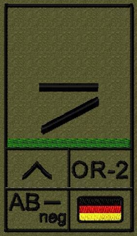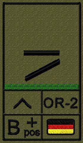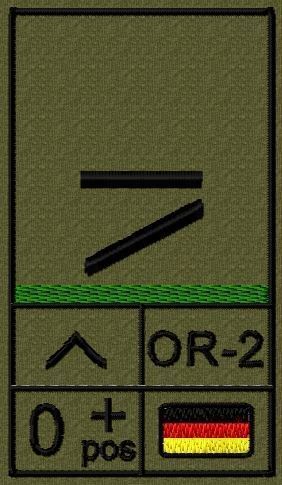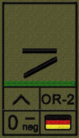 Dienstgradabzeichen auf Klett mit NATO-Rangcode, dem US Army-Dienstgrad, der Deutschlandflagge und der Blutgruppe mit Rhesusfaktor aufgestickt. Passt ideal auf das BW Unterhemd mit Klett auf der Brust oder auch auf dem Smock. Der Patch hat die Maße: B: 5,2cm x L: 9,3cm. Achtung: Bei der Auswahl der