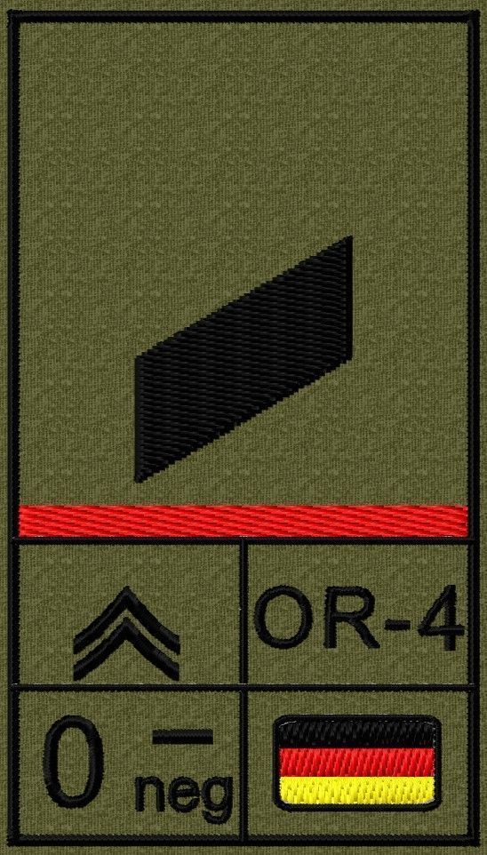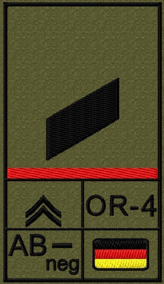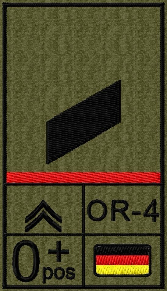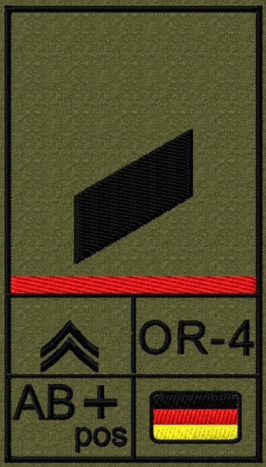 Dienstgradabzeichen auf Klett mit NATO-Rangcode, dem US Army-Dienstgrad, der Deutschlandflagge und der Blutgruppe mit Rhesusfaktor aufgestickt. Passt ideal auf das BW Unterhemd mit Klett auf der Brust oder auch auf dem Smock. Der Patch hat die Maße: B: 5,2cm x L: 9,3cm. Achtung: Bei der Auswahl der