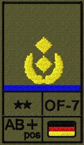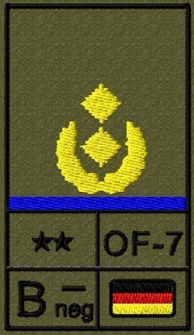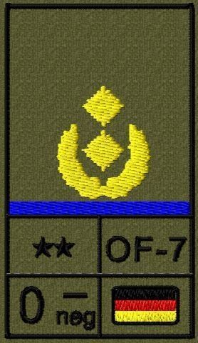 Dienstgradabzeichen auf Klett mit NATO-Rangcode, dem US Army-Dienstgrad, der Deutschlandflagge und der Blutgruppe mit Rhesusfaktor aufgestickt. Passt ideal auf das BW Unterhemd mit Klett auf der Brust oder auch auf dem Smock. Der Patch hat die Maße: B: 5,2cm x L: 9,3cm. Achtung: Bei der Auswahl der