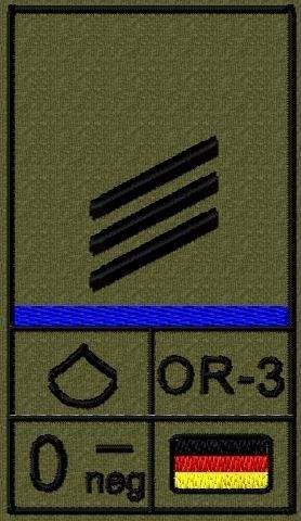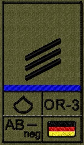 Dienstgradabzeichen auf Klett mit NATO-Rangcode, dem US Army-Dienstgrad, der Deutschlandflagge und der Blutgruppe mit Rhesusfaktor aufgestickt. Passt ideal auf das BW Unterhemd mit Klett auf der Brust oder auch auf dem Smock. Der Patch hat die Maße: B: 5,2cm x L: 9,3cm. Achtung: Bei der Auswahl der