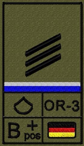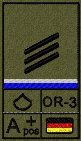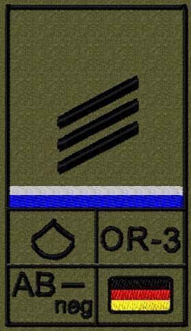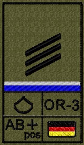 Dienstgradabzeichen auf Klett mit NATO-Rangcode, dem US Army-Dienstgrad, der Deutschlandflagge und der Blutgruppe mit Rhesusfaktor aufgestickt. Passt ideal auf das BW Unterhemd mit Klett auf der Brust oder auch auf dem Smock. Der Patch hat die Maße: B: 5,2cm x L: 9,3cm. Achtung: Bei der Auswahl der