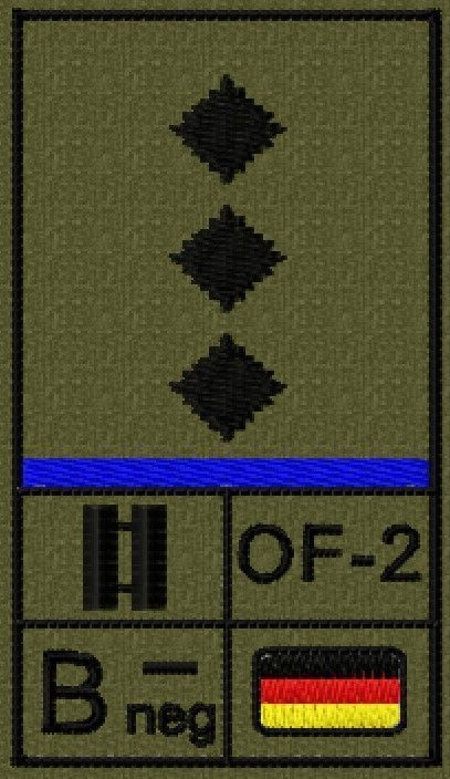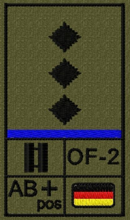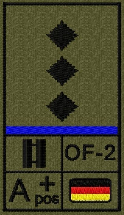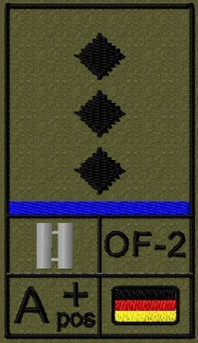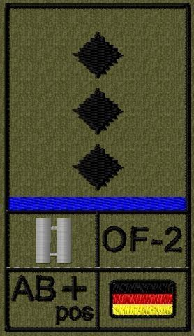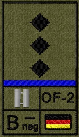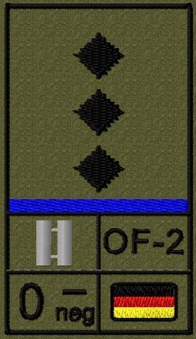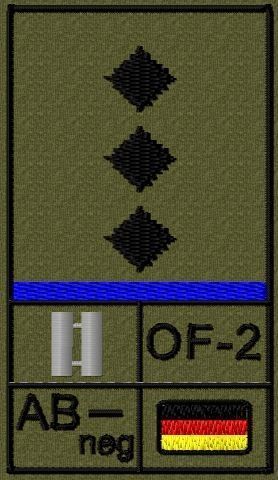 Dienstgradabzeichen auf Klett mit NATO-Rangcode, dem US Army-Dienstgrad, der Deutschlandflagge und der Blutgruppe mit Rhesusfaktor aufgestickt. Passt ideal auf das BW Unterhemd mit Klett auf der Brust oder auch auf dem Smock. Der Patch hat die Maße: B: 5,2cm x L: 9,3cm. Achtung: Bei der Auswahl der