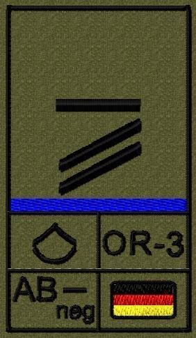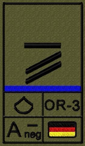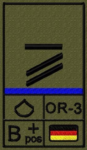 Dienstgradabzeichen auf Klett mit NATO-Rangcode, dem US Army-Dienstgrad, der Deutschlandflagge und der Blutgruppe mit Rhesusfaktor aufgestickt. Passt ideal auf das BW Unterhemd mit Klett auf der Brust oder auch auf dem Smock. Der Patch hat die Maße: B: 5,2cm x L: 9,3cm. Achtung: Bei der Auswahl der