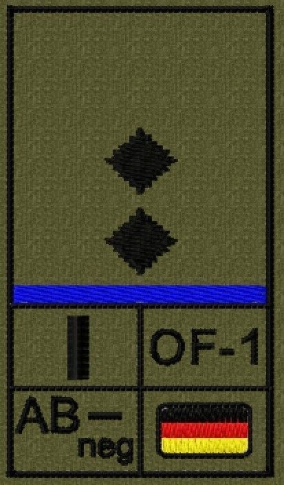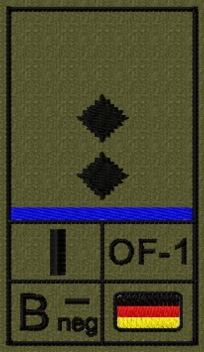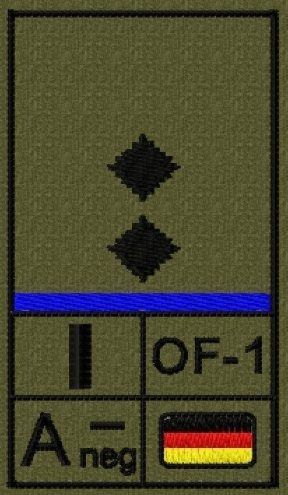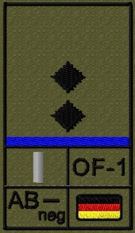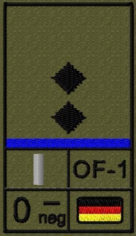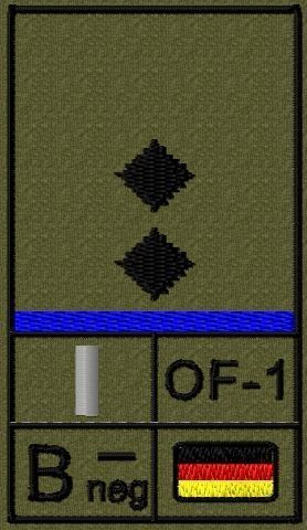Dienstgradabzeichen auf Klett mit NATO-Rangcode, dem US Army-Dienstgrad, der Deutschlandflagge und der Blutgruppe mit Rhesusfaktor aufgestickt. Passt ideal auf das BW Unterhemd mit Klett auf der Brust oder auch auf dem Smock. Der Patch hat die Maße: B: 5,2cm x L: 9,3cm. Achtung: Bei der Auswahl der