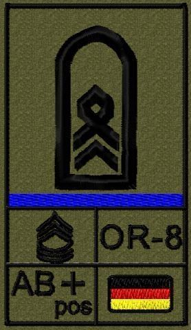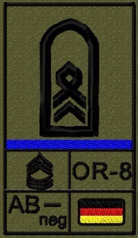 Dienstgradabzeichen auf Klett mit NATO-Rangcode, dem US Army-Dienstgrad, der Deutschlandflagge und der Blutgruppe mit Rhesusfaktor aufgestickt. Passt ideal auf das BW Unterhemd mit Klett auf der Brust oder auch auf dem Smock. Der Patch hat die Maße: B: 5,2cm x L: 9,3cm. Achtung: Bei der Auswahl der