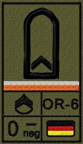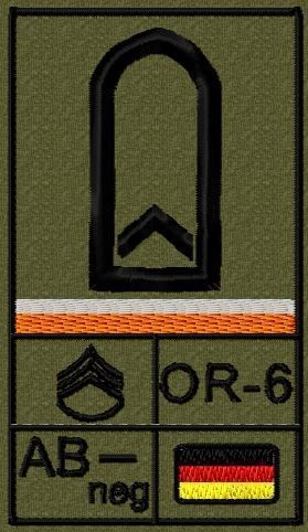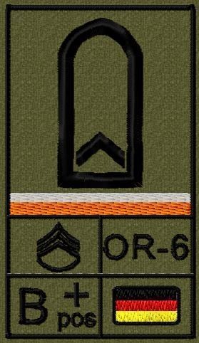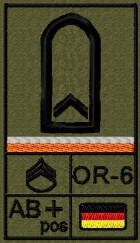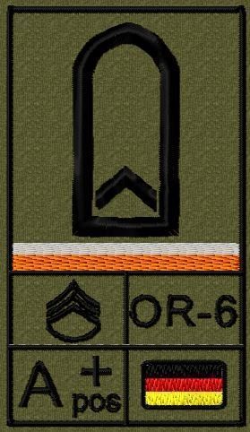 Dienstgradabzeichen auf Klett mit NATO-Rangcode, dem US Army-Dienstgrad, der Deutschlandflagge und der Blutgruppe mit Rhesusfaktor aufgestickt. Passt ideal auf das BW Unterhemd mit Klett auf der Brust oder auch auf dem Smock. Der Patch hat die Maße: B: 5,2cm x L: 9,3cm. Achtung: Bei der Auswahl der