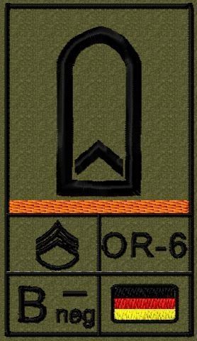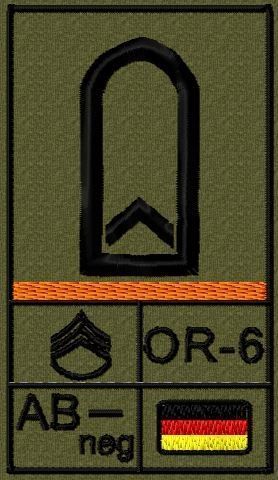 Dienstgradabzeichen auf Klett mit NATO-Rangcode, dem US Army-Dienstgrad, der Deutschlandflagge und der Blutgruppe mit Rhesusfaktor aufgestickt. Passt ideal auf das BW Unterhemd mit Klett auf der Brust oder auch auf dem Smock. Der Patch hat die Maße: B: 5,2cm x L: 9,3cm. Achtung: Bei der Auswahl der