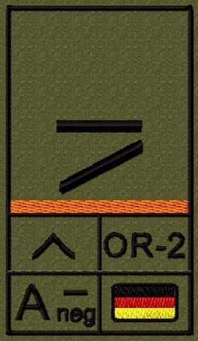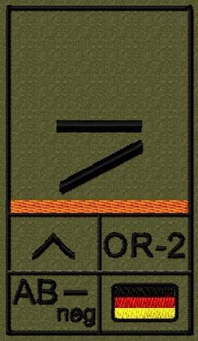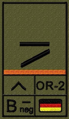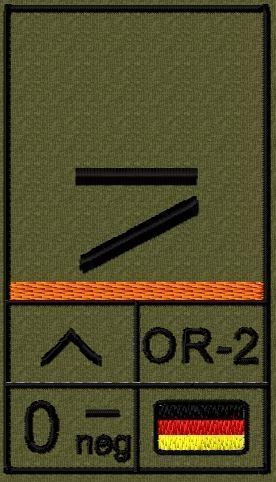 Dienstgradabzeichen auf Klett mit NATO-Rangcode, dem US Army-Dienstgrad, der Deutschlandflagge und der Blutgruppe mit Rhesusfaktor aufgestickt. Passt ideal auf das BW Unterhemd mit Klett auf der Brust oder auch auf dem Smock. Der Patch hat die Maße: B: 5,2cm x L: 9,3cm. Achtung: Bei der Auswahl der
