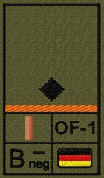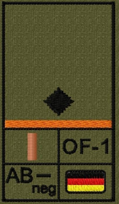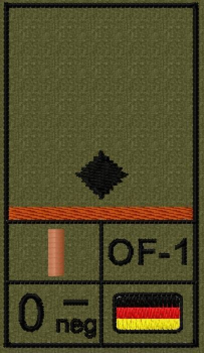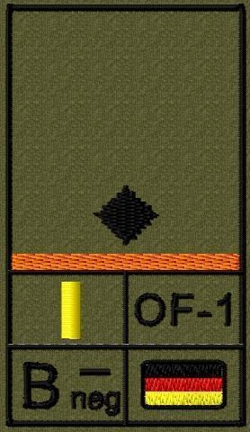 Dienstgradabzeichen auf Klett mit NATO-Rangcode, dem US Army-Dienstgrad, der Deutschlandflagge und der Blutgruppe mit Rhesusfaktor aufgestickt. Passt ideal auf das BW Unterhemd mit Klett auf der Brust oder auch auf dem Smock. Der Patch hat die Maße: B: 5,2cm x L: 9,3cm. Achtung: Bei der Auswahl der