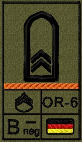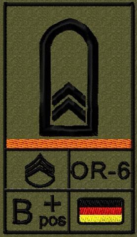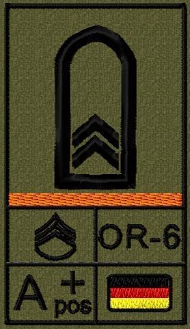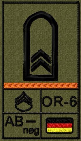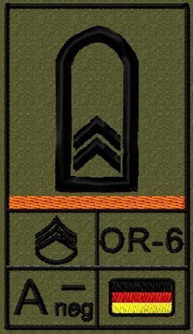 Dienstgradabzeichen auf Klett mit NATO-Rangcode, dem US Army-Dienstgrad, der Deutschlandflagge und der Blutgruppe mit Rhesusfaktor aufgestickt. Passt ideal auf das BW Unterhemd mit Klett auf der Brust oder auch auf dem Smock. Der Patch hat die Maße: B: 5,2cm x L: 9,3cm. Achtung: Bei der Auswahl der