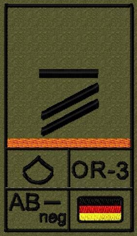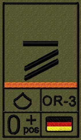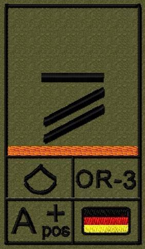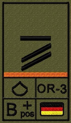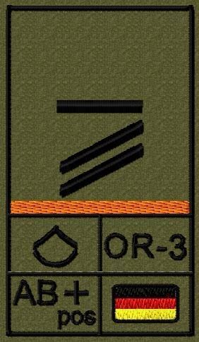Dienstgradabzeichen auf Klett mit NATO-Rangcode, dem US Army-Dienstgrad, der Deutschlandflagge und der Blutgruppe mit Rhesusfaktor aufgestickt. Passt ideal auf das BW Unterhemd mit Klett auf der Brust oder auch auf dem Smock. Der Patch hat die Maße: B: 5,2cm x L: 9,3cm. Achtung: Bei der Auswahl der