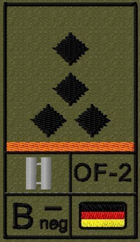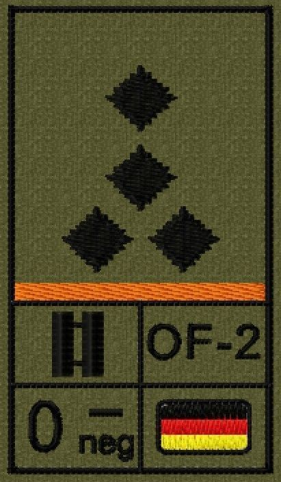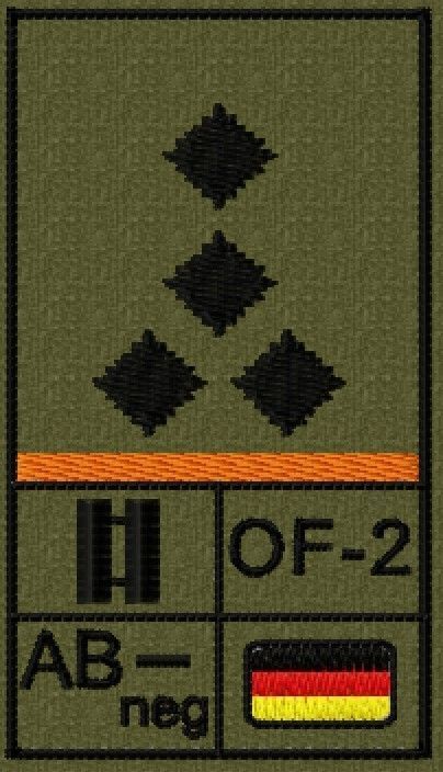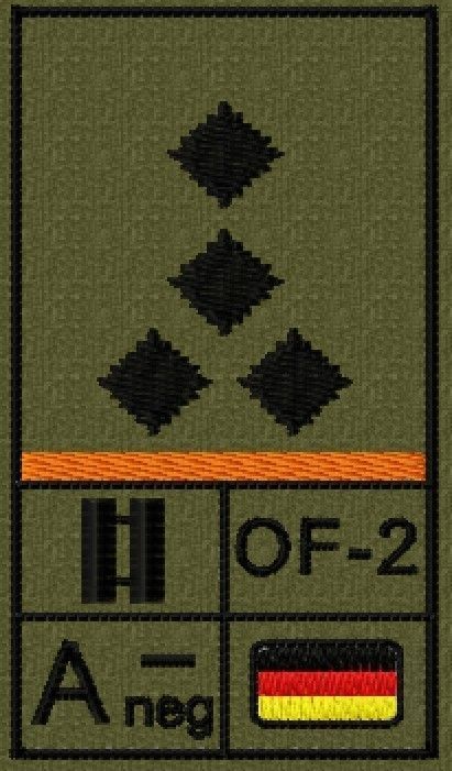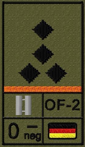 Dienstgradabzeichen auf Klett mit NATO-Rangcode, dem US Army-Dienstgrad, der Deutschlandflagge und der Blutgruppe mit Rhesusfaktor aufgestickt. Passt ideal auf das BW Unterhemd mit Klett auf der Brust oder auch auf dem Smock. Der Patch hat die Maße: B: 5,2cm x L: 9,3cm. Achtung: Bei der Auswahl der