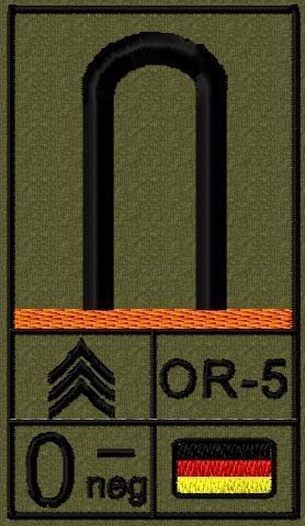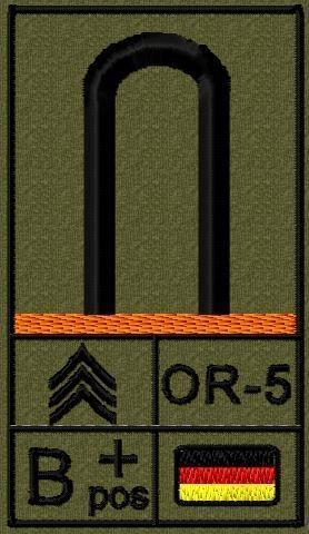 Dienstgradabzeichen auf Klett mit NATO-Rangcode, dem US Army-Dienstgrad, der Deutschlandflagge und der Blutgruppe mit Rhesusfaktor aufgestickt. Passt ideal auf das BW Unterhemd mit Klett auf der Brust oder auch auf dem Smock. Der Patch hat die Maße: B: 5,2cm x L: 9,3cm. Achtung: Bei der Auswahl der