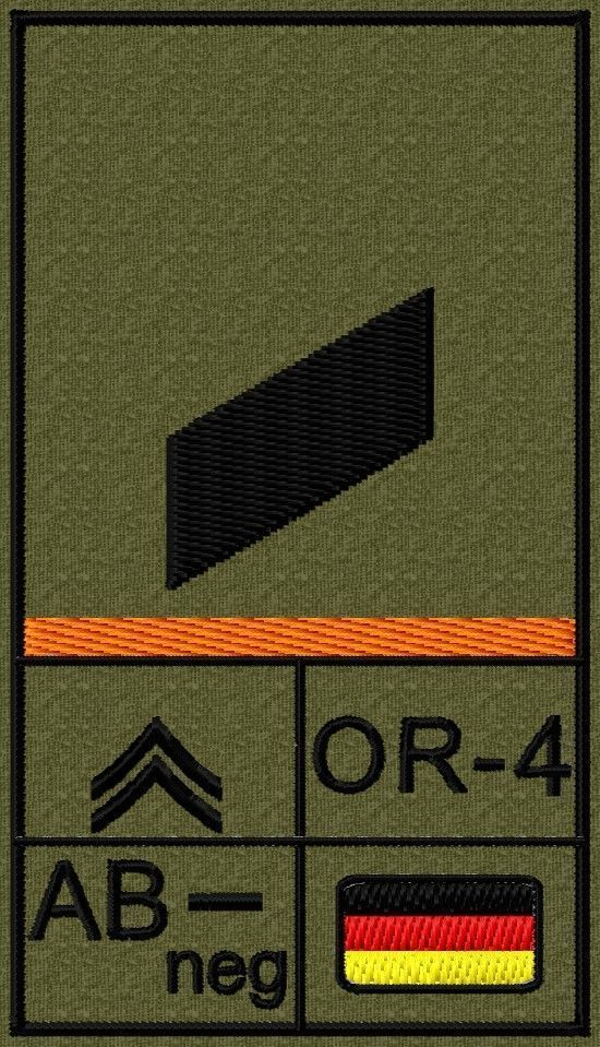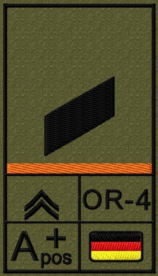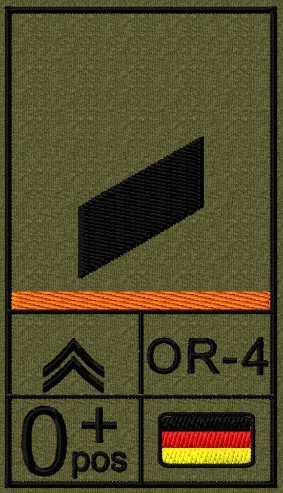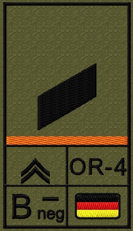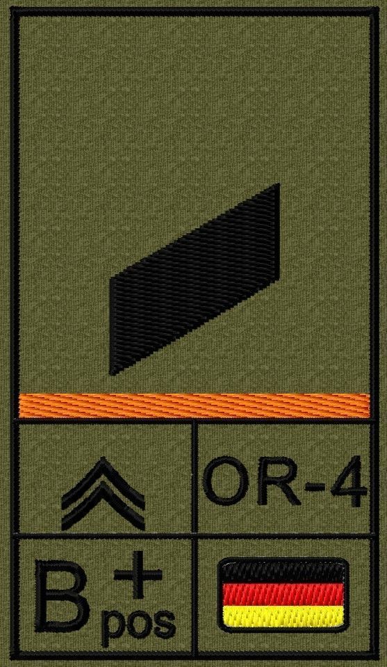 Dienstgradabzeichen auf Klett mit NATO-Rangcode, dem US Army-Dienstgrad, der Deutschlandflagge und der Blutgruppe mit Rhesusfaktor aufgestickt. Passt ideal auf das BW Unterhemd mit Klett auf der Brust oder auch auf dem Smock. Der Patch hat die Maße: B: 5,2cm x L: 9,3cm. Achtung: Bei der Auswahl der