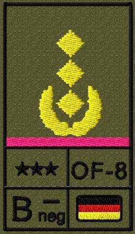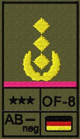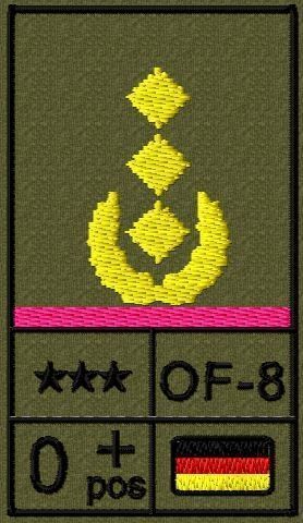 Dienstgradabzeichen auf Klett mit NATO-Rangcode, dem US Army-Dienstgrad, der Deutschlandflagge und der Blutgruppe mit Rhesusfaktor aufgestickt. Passt ideal auf das BW Unterhemd mit Klett auf der Brust oder auch auf dem Smock. Der Patch hat die Maße: B: 5,2cm x L: 9,3cm. Achtung: Bei der Auswahl der