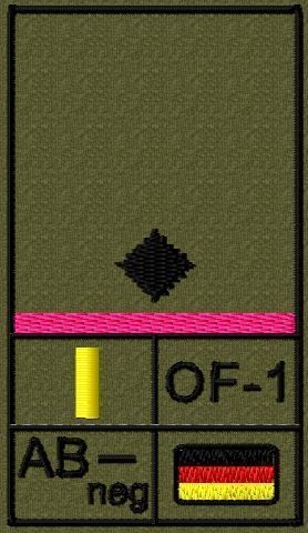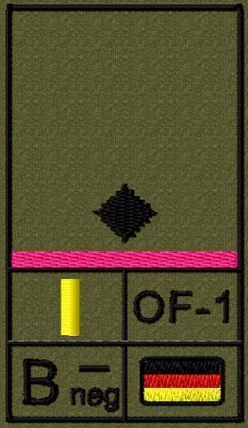 Dienstgradabzeichen auf Klett mit NATO-Rangcode, dem US Army-Dienstgrad, der Deutschlandflagge und der Blutgruppe mit Rhesusfaktor aufgestickt. Passt ideal auf das BW Unterhemd mit Klett auf der Brust oder auch auf dem Smock. Der Patch hat die Maße: B: 5,2cm x L: 9,3cm. Achtung: Bei der Auswahl der
