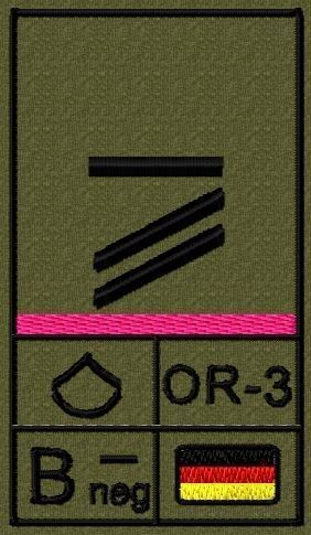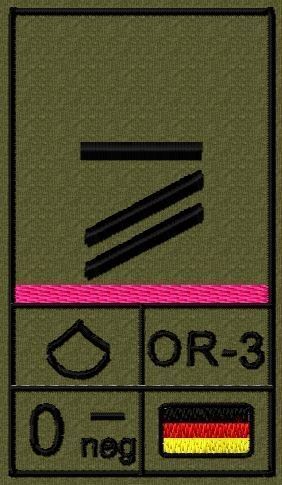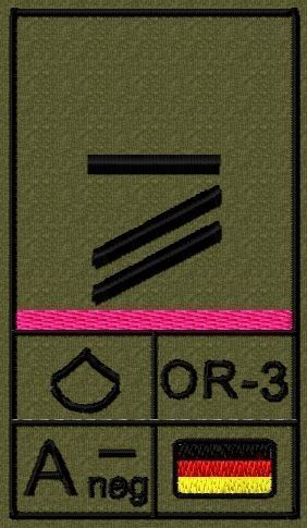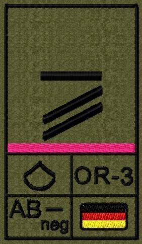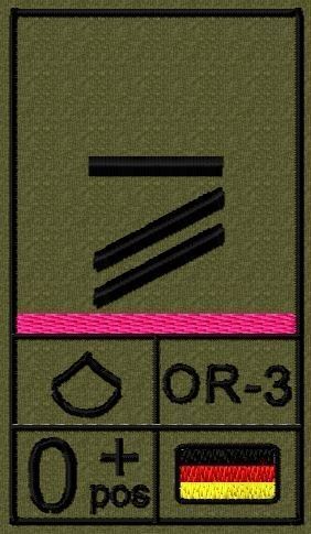 Dienstgradabzeichen auf Klett mit NATO-Rangcode, dem US Army-Dienstgrad, der Deutschlandflagge und der Blutgruppe mit Rhesusfaktor aufgestickt. Passt ideal auf das BW Unterhemd mit Klett auf der Brust oder auch auf dem Smock. Der Patch hat die Maße: B: 5,2cm x L: 9,3cm. Achtung: Bei der Auswahl der