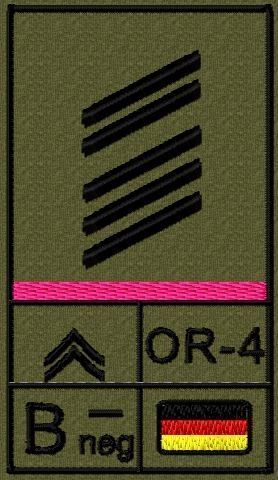 Dienstgradabzeichen auf Klett mit NATO-Rangcode, dem US Army-Dienstgrad, der Deutschlandflagge und der Blutgruppe mit Rhesusfaktor aufgestickt. Passt ideal auf das BW Unterhemd mit Klett auf der Brust oder auch auf dem Smock. Der Patch hat die Maße: B: 5,2cm x L: 9,3cm. Achtung: Bei der Auswahl der