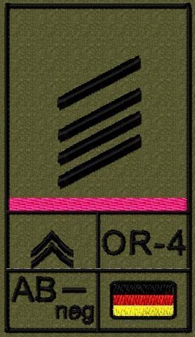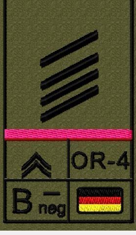 Dienstgradabzeichen auf Klett mit NATO-Rangcode, dem US Army-Dienstgrad, der Deutschlandflagge und der Blutgruppe mit Rhesusfaktor aufgestickt. Passt ideal auf das BW Unterhemd mit Klett auf der Brust oder auch auf dem Smock. Der Patch hat die Maße: B: 5,2cm x L: 9,3cm. Achtung: Bei der Auswahl der