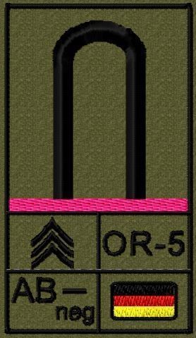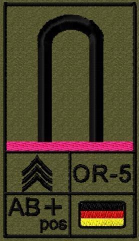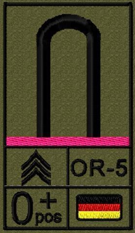Dienstgradabzeichen auf Klett mit NATO-Rangcode, dem US Army-Dienstgrad, der Deutschlandflagge und der Blutgruppe mit Rhesusfaktor aufgestickt. Passt ideal auf das BW Unterhemd mit Klett auf der Brust oder auch auf dem Smock. Der Patch hat die Maße: B: 5,2cm x L: 9,3cm. Achtung: Bei der Auswahl der