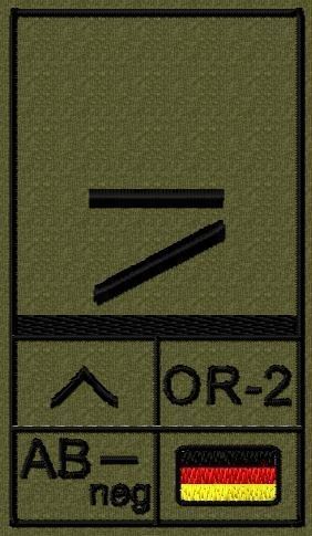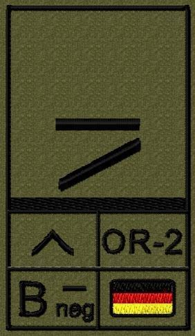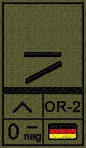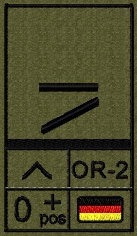 Dienstgradabzeichen auf Klett mit NATO-Rangcode, dem US Army-Dienstgrad, der Deutschlandflagge und der Blutgruppe mit Rhesusfaktor aufgestickt. Passt ideal auf das BW Unterhemd mit Klett auf der Brust oder auch auf dem Smock. Der Patch hat die Maße: B: 5,2cm x L: 9,3cm. Achtung: Bei der Auswahl der