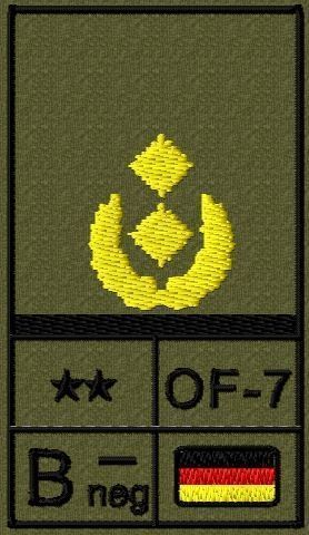 Dienstgradabzeichen auf Klett mit NATO-Rangcode, dem US Army-Dienstgrad, der Deutschlandflagge und der Blutgruppe mit Rhesusfaktor aufgestickt. Passt ideal auf das BW Unterhemd mit Klett auf der Brust oder auch auf dem Smock. Der Patch hat die Maße: B: 5,2cm x L: 9,3cm. Achtung: Bei der Auswahl der