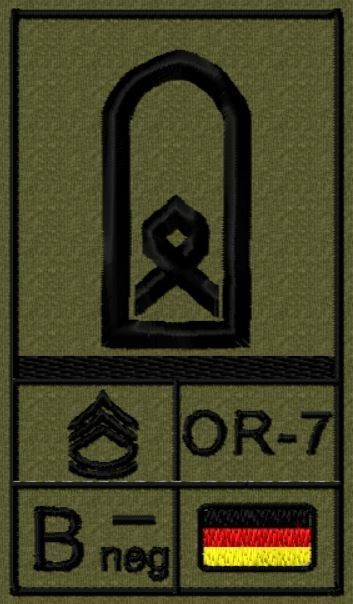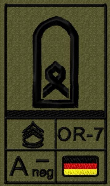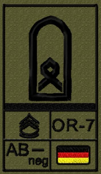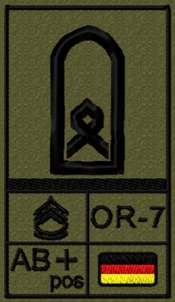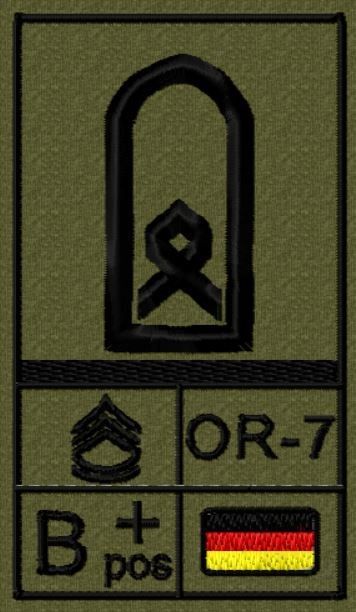 Dienstgradabzeichen auf Klett mit NATO-Rangcode, dem US Army-Dienstgrad, der Deutschlandflagge und der Blutgruppe mit Rhesusfaktor aufgestickt. Passt ideal auf das BW Unterhemd mit Klett auf der Brust oder auch auf dem Smock. Der Patch hat die Maße: B: 5,2cm x L: 9,3cm. Wir halten uns bei der Zuordn