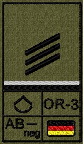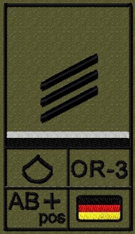 Dienstgradabzeichen auf Klett mit NATO-Rangcode, dem US Army-Dienstgrad, der Deutschlandflagge und der Blutgruppe mit Rhesusfaktor aufgestickt. Passt ideal auf das BW Unterhemd mit Klett auf der Brust oder auch auf dem Smock. Der Patch hat die Maße: B: 5,2cm x L: 9,3cm. Achtung: Bei der Auswahl der