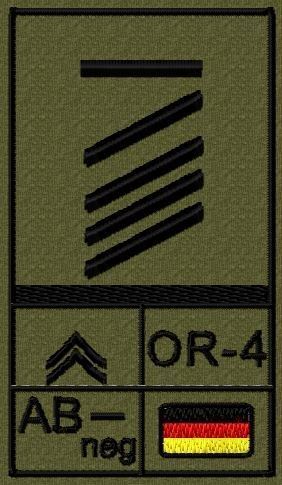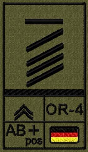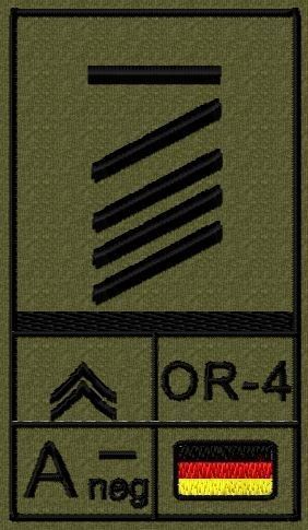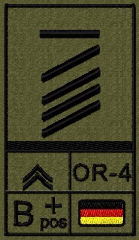 Dienstgradabzeichen auf Klett mit NATO-Rangcode, dem US Army-Dienstgrad, der Deutschlandflagge und der Blutgruppe mit Rhesusfaktor aufgestickt. Passt ideal auf das BW Unterhemd mit Klett auf der Brust oder auch auf dem Smock. Der Patch hat die Maße: B: 5,2cm x L: 9,3cm. Achtung: Bei der Auswahl der
