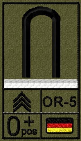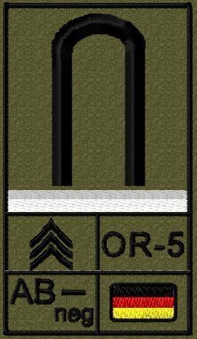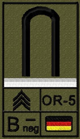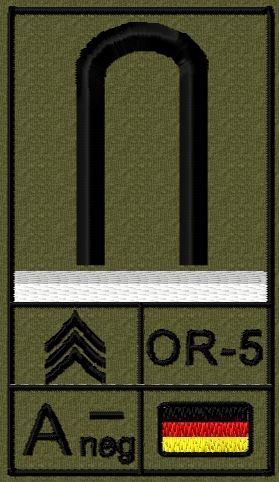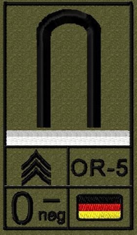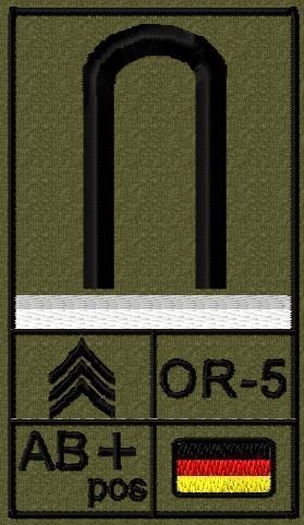 Dienstgradabzeichen auf Klett mit NATO-Rangcode, dem US Army-Dienstgrad, der Deutschlandflagge und der Blutgruppe mit Rhesusfaktor aufgestickt. Passt ideal auf das BW Unterhemd mit Klett auf der Brust oder auch auf dem Smock. Der Patch hat die Maße: B: 5,2cm x L: 9,3cm. Achtung: Bei der Auswahl der