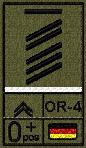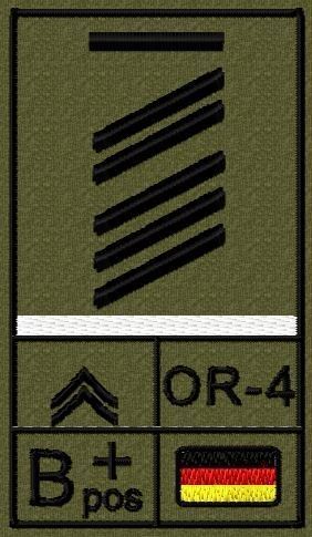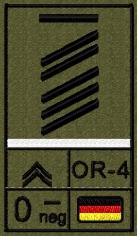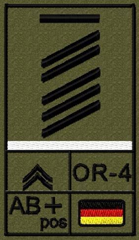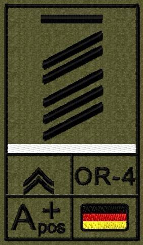 Dienstgradabzeichen auf Klett mit NATO-Rangcode, dem US Army-Dienstgrad, der Deutschlandflagge und der Blutgruppe mit Rhesusfaktor aufgestickt. Passt ideal auf das BW Unterhemd mit Klett auf der Brust oder auch auf dem Smock. Der Patch hat die Maße: B: 5,2cm x L: 9,3cm. Achtung: Bei der Auswahl der